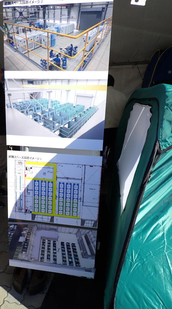 梅林にあるカンケンテクノ株式会社は、梅林地区の避難所としてなにかあるときは機能してくれるとのこと。何かあれば、会社が避難所になる図が大俵祭り会場に展示してあった。工場長さんから説明をうけた。必要な資材は会社が用意してくれるとのこと。嬉しすぎです。写真左は設置スペースのイメージです。左はパティーションとしてつかうテントの見本です。